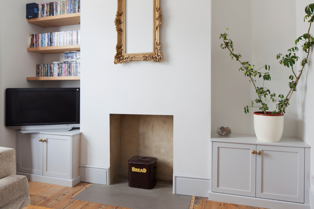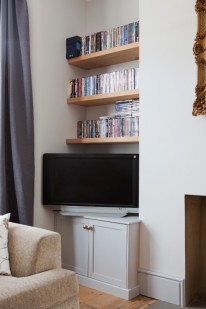 Reclaimed pine joists have been used for these ‘floating’ alcove shelves. The cupboards are spray finished, featuring panelled doors and vintage handles.