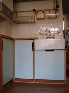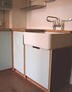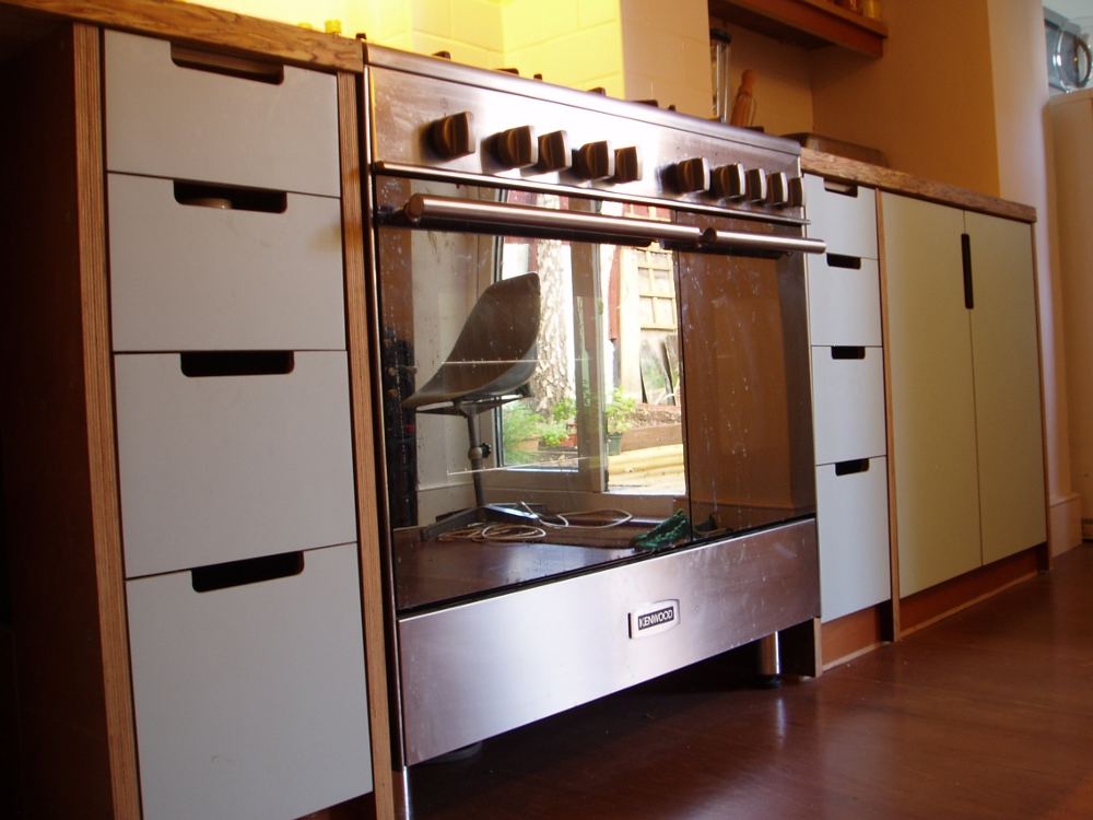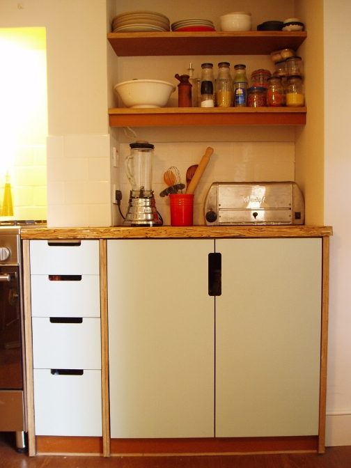 Rounded routed handles and baby blue Formica pair up with floating shelves made from reclaimed poster boards in this retro kitchen. The worktop is made from reclaimed support beams.