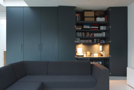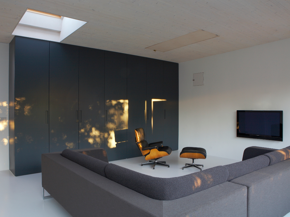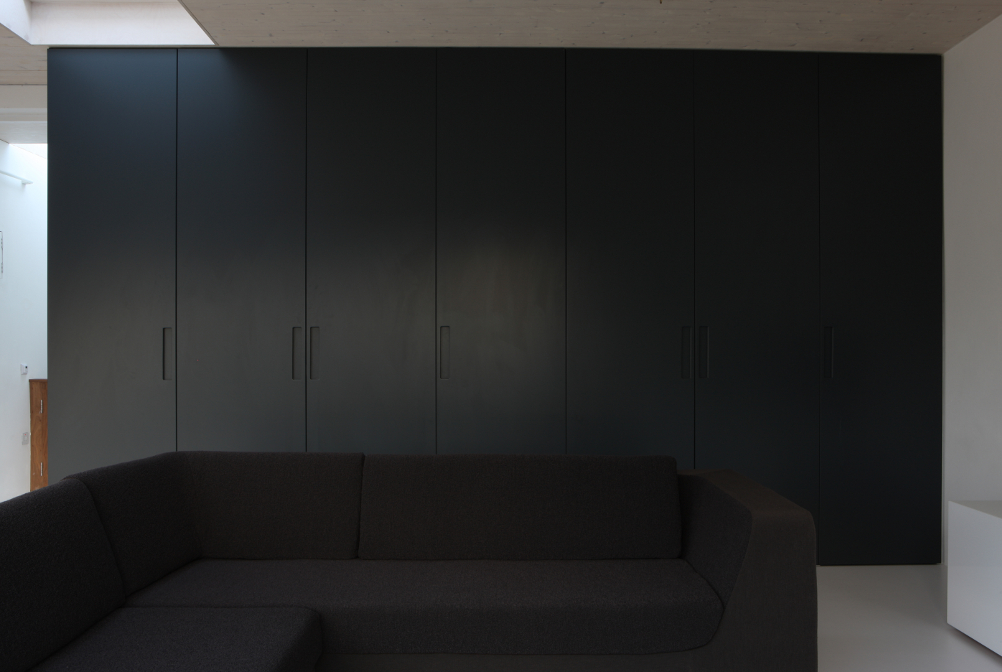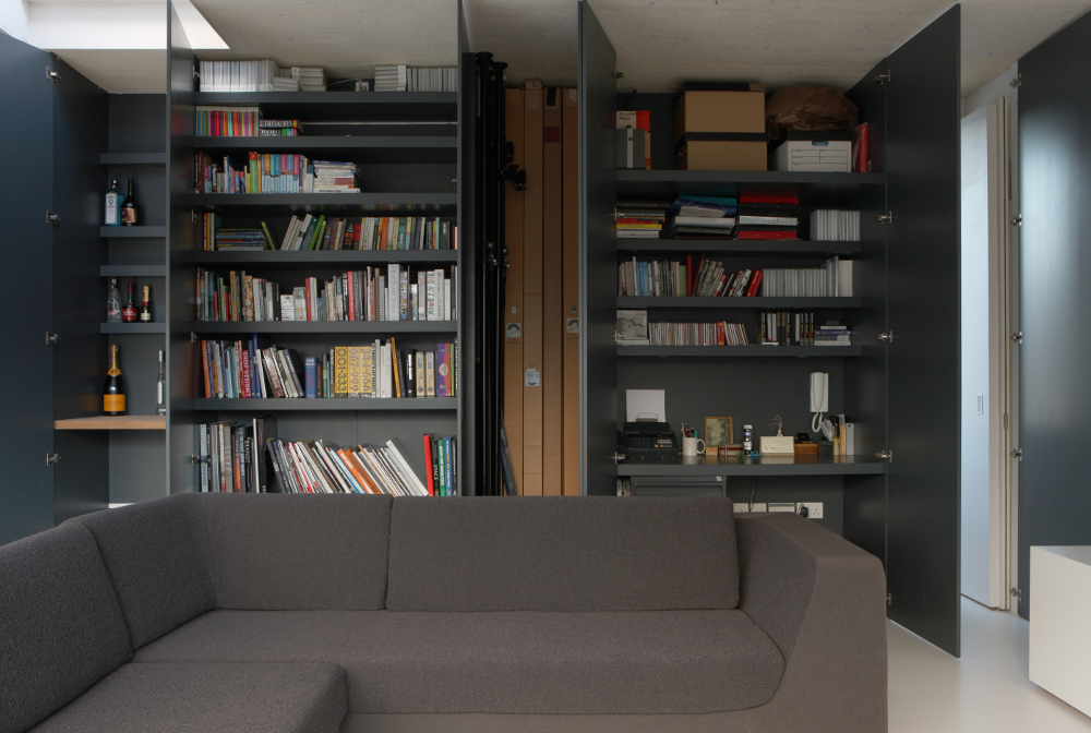 This storage was designed to hide a photographer’s office space, reference books, bar and doorway through to the next room. The sleek, 9-foot doors complete the room’s minimalist look when closed.