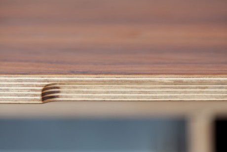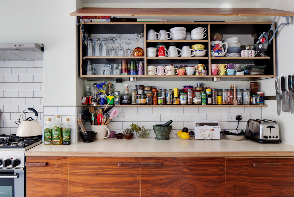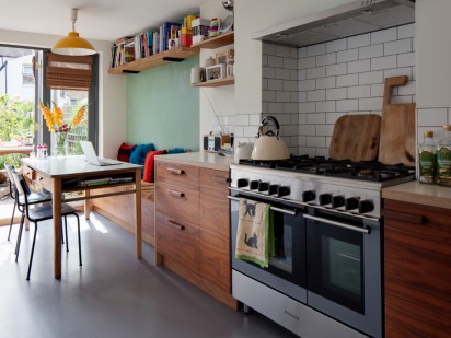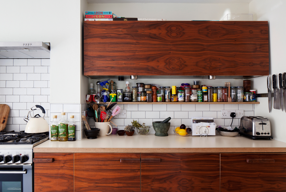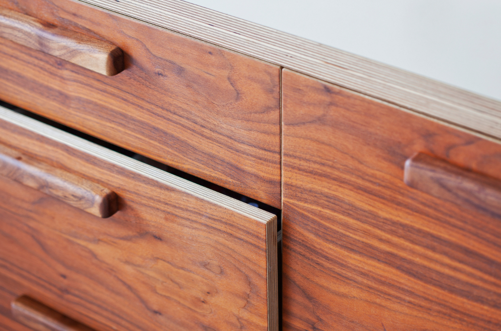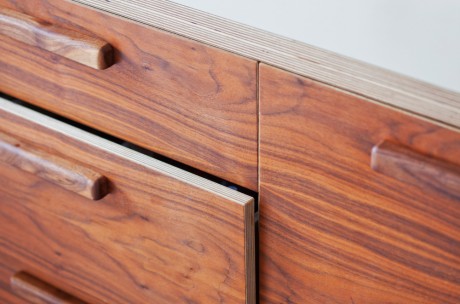 These kitchen cupboards were made so that the grain runs across the doors, showing off the flow of the walnut veneer. The handles are made from solid walnut creating a seamless finish. The whole kitchen uses birch ply as a substrate, with a Formica work surface and phenolic-faced carcasses.